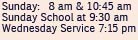 Service Hours: Sundays – 8 am & 10:45 am Wednesdays 7:15 pm_____ Lent and Advent Services:Wednesdays 3:30pm & 7:15 pm